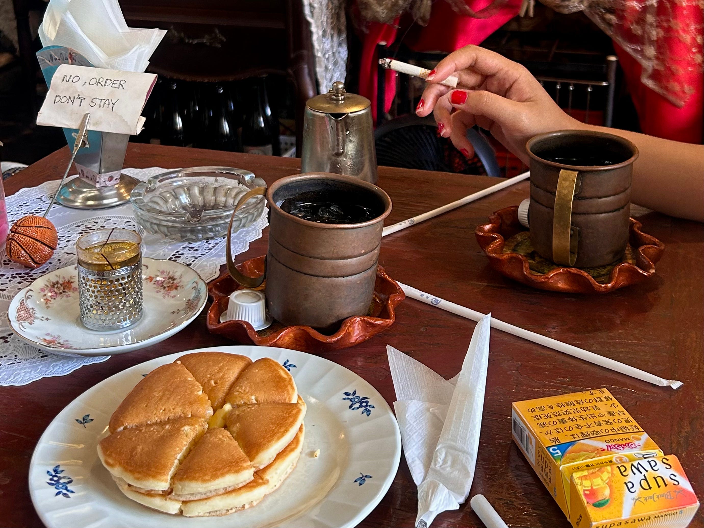 這間店叫Rose Room,位在國際通附近,由一個老爺爺獨自經營,店內擺滿各式收藏品和唱片,給我一種昭和加大正的風情,擁擠但不雜亂,販賣便宜又好吃的餐食和咖啡,更棒的是店內可以抽菸。我在沖繩這段期間抽的都是芒果味的涼菸,和日系淡咖啡跟奶油鬆餅混在一起,是意外相襯的熱帶甜膩。